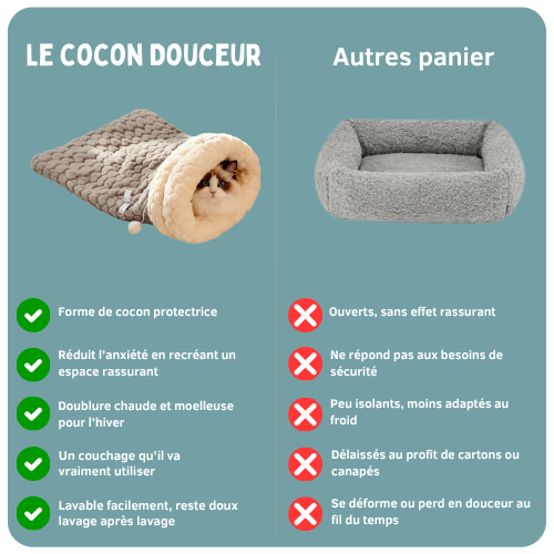 Le Cocon Douceur est spécialement conçu pour répondre à l’instinct naturel des félins qui adorent se cacher dans des espaces confinés.