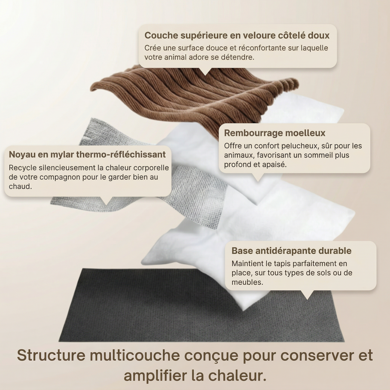 Il capte la chaleur naturelle du corps de votre animal et la renvoie vers lui, créant une sensation de chaleur douce dès qu’il s’y allonge.