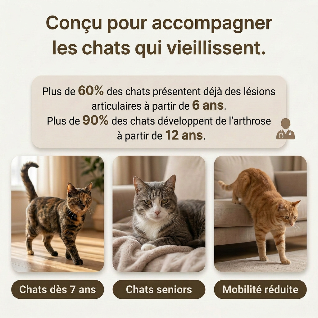 Avec l'âge, après une blessure ou simplement avec le temps, le corps de votre chat devient plus sensible. Les articulations sont plus raides, les muscles plus tendus, et les mouvements plus difficiles, surtout au repos et au réveil.
