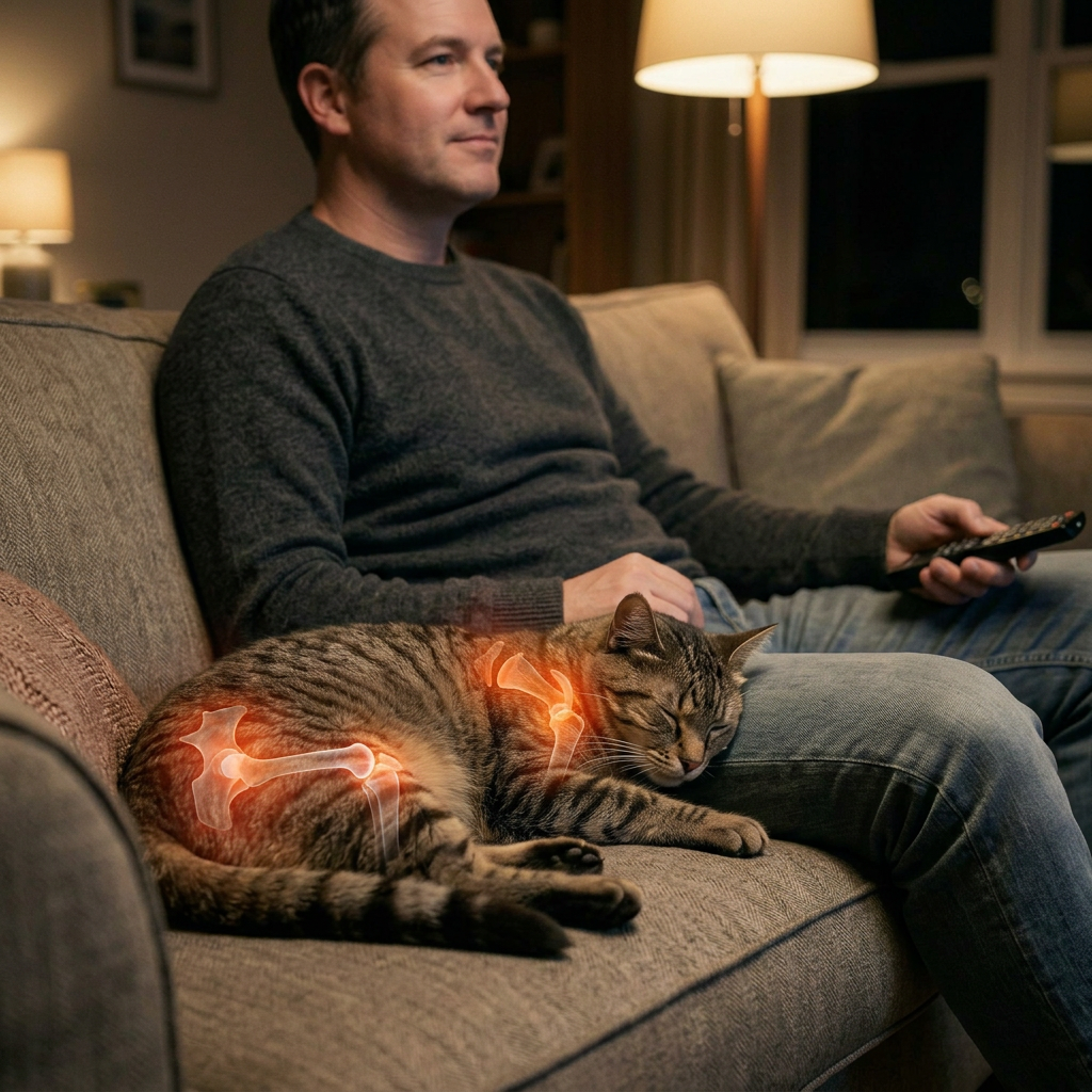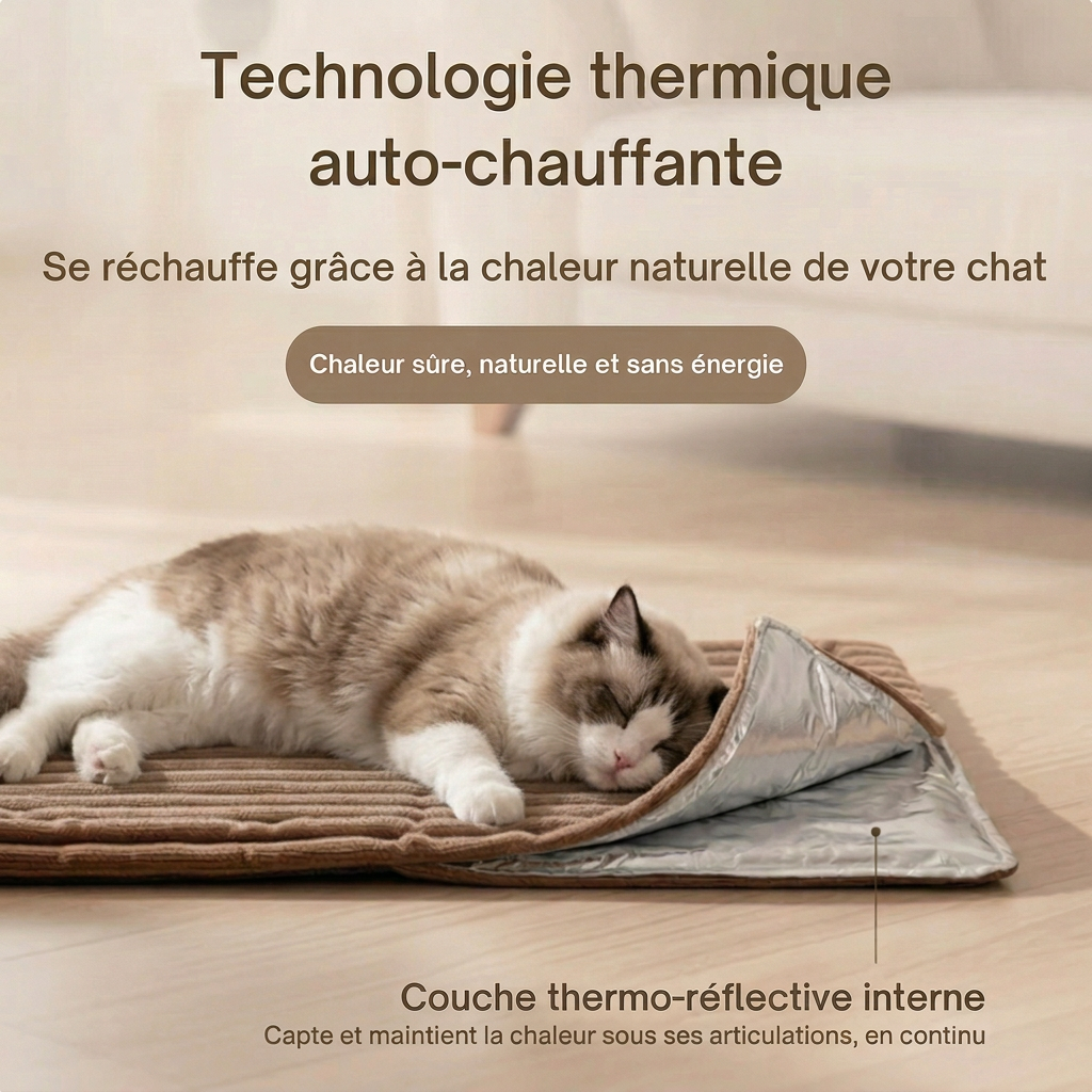 Son principe est simple : au lieu de laisser la chaleur naturelle du corps de votre chat se disperser dans l'air, il la capte et la renvoie directement là où elle est utile — sous ses articulations.