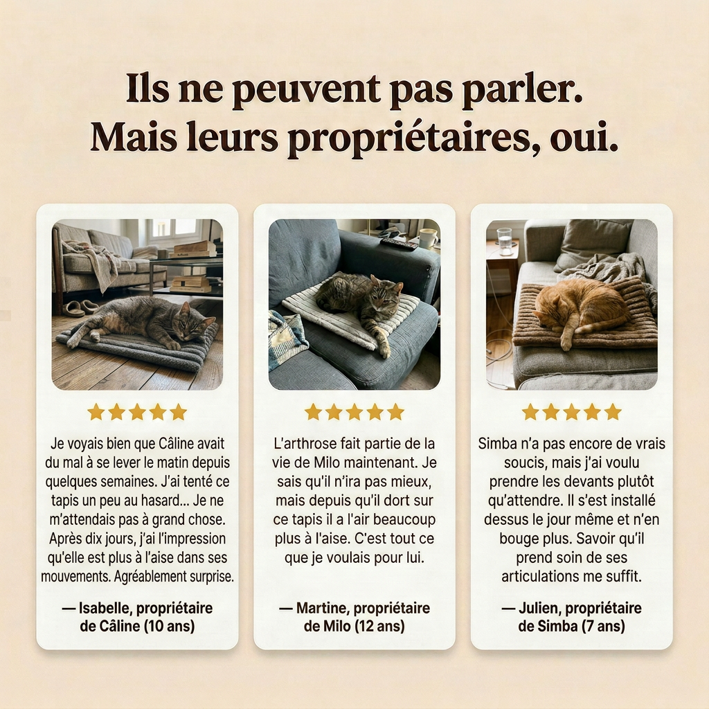 Utiliser ce tapis de manière préventive, c'est agir avant que les signes apparaissent — pas après. De nombreux propriétaires l'ont adopté alors que leur chat semblait aller bien, et ont constaté une différence dans sa mobilité et son confort au quotidien.